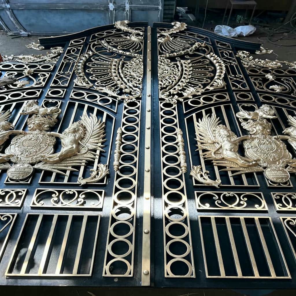 تزئینات درب ویلایی فرفورژه تزئینات روی درب ویلایی فرفورژه می تواند شامل گل نرده تاج قطعات چدنی لیزری و فرم های کلاسیک یا مدرن باشد و در صورت نیاز ورق پشت کار به صورت مشبک یا پر اضافه می شود تا هم حریم خصوصی حفظ شود و هم ظاهر هماهنگ با نمای ساختمان ایجاد گردد.